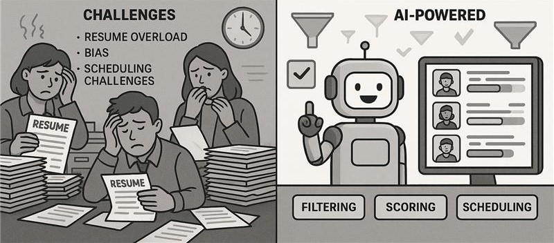 Screening technical profiles manually took 2–3 days per job. Delays in interview scheduling due to calendar clashes. Difficulty filtering top talent from large applicant pools.